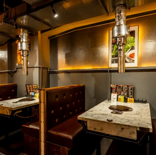 【4名様掛けテーブル席×2卓】コンロ付きのお席は、お肉を焼きながら楽しくお食事や会話を満喫いただけます♪お子様連れのファミリーや仲の良い友人などにオススメな4人掛け席は、席同士のゆとりも程よく快適なお席です。