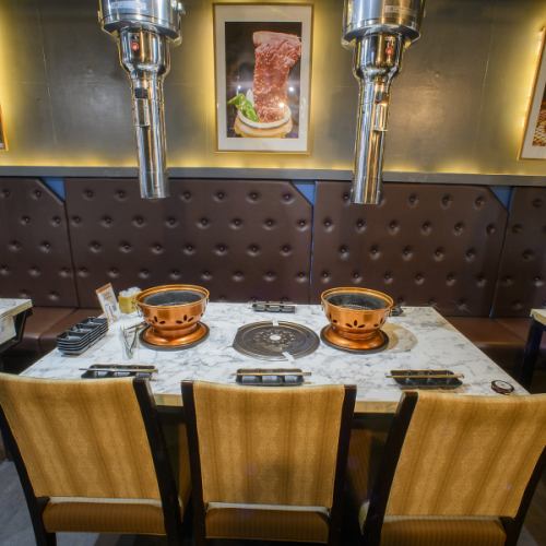【6名様掛けテーブル席×3卓】コンロ付きのお席は、お肉を焼きながら楽しくお食事や会話を満喫いただけます♪家族や友人とのプライベートな食事から、仕事での各種ご宴会などビジネスシーンにも使い勝手の良いお席です。